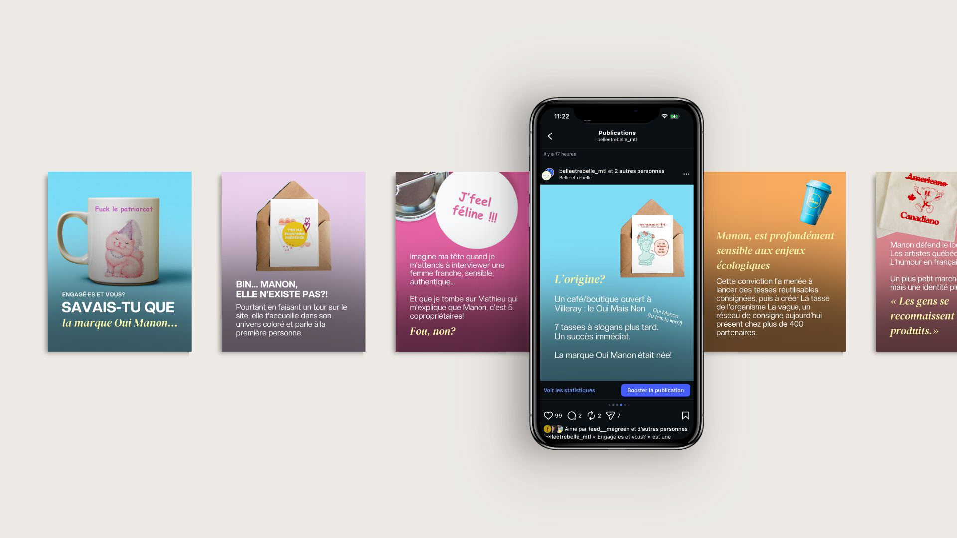 « Engagé·es et vous? » sensibilise aux enjeux de création locale. Je suis partie à la rencontre des créateur·ices avec lesquelles Belle et rebelle collabore pour en apprendre plus sur leurs engagements. Production locale, savoir-faire, écoresponsabilité, féminisme, entrepreneuriat, iels m'ont partagé leurs combats que j'ai essayé de retranscrire au mieux en contenu de communication. Tout le contenu est à retrouver sur le site de Belle et rebelle pour lire les articles et sur l'Instagram de la compagnie pour découvrir les posts et réels.